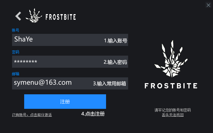 - 注册任何菜单的账号密码与游戏内的完全无关,选适合你的独一无二的好记的,不建议账号密码都输入QQ号等很容易被盗的信息
